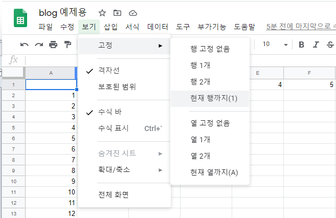 구글 스프레드시트는 선택된 셀의 오른쪽과 아랫쪽으로 틀 고정이 되네요.