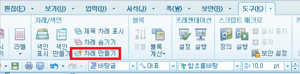 5. 목차를 만들 페이지로 이동하여 '도구' > '차례만들기' 팝업 메뉴에서