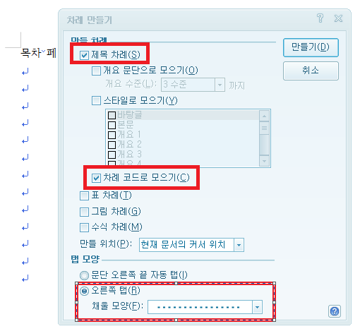 '제목 차례'체크, '차례 코드로 모으기' 체크 후